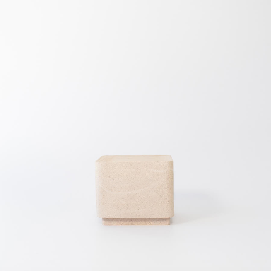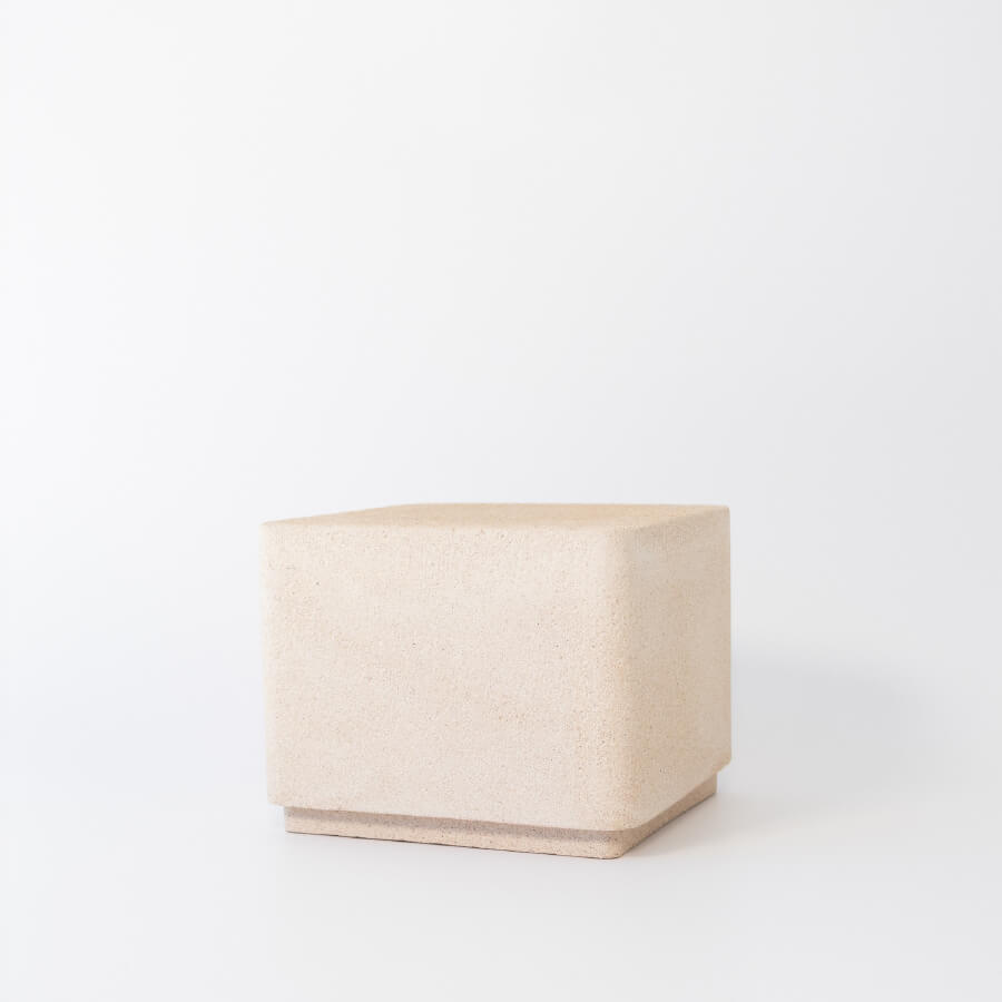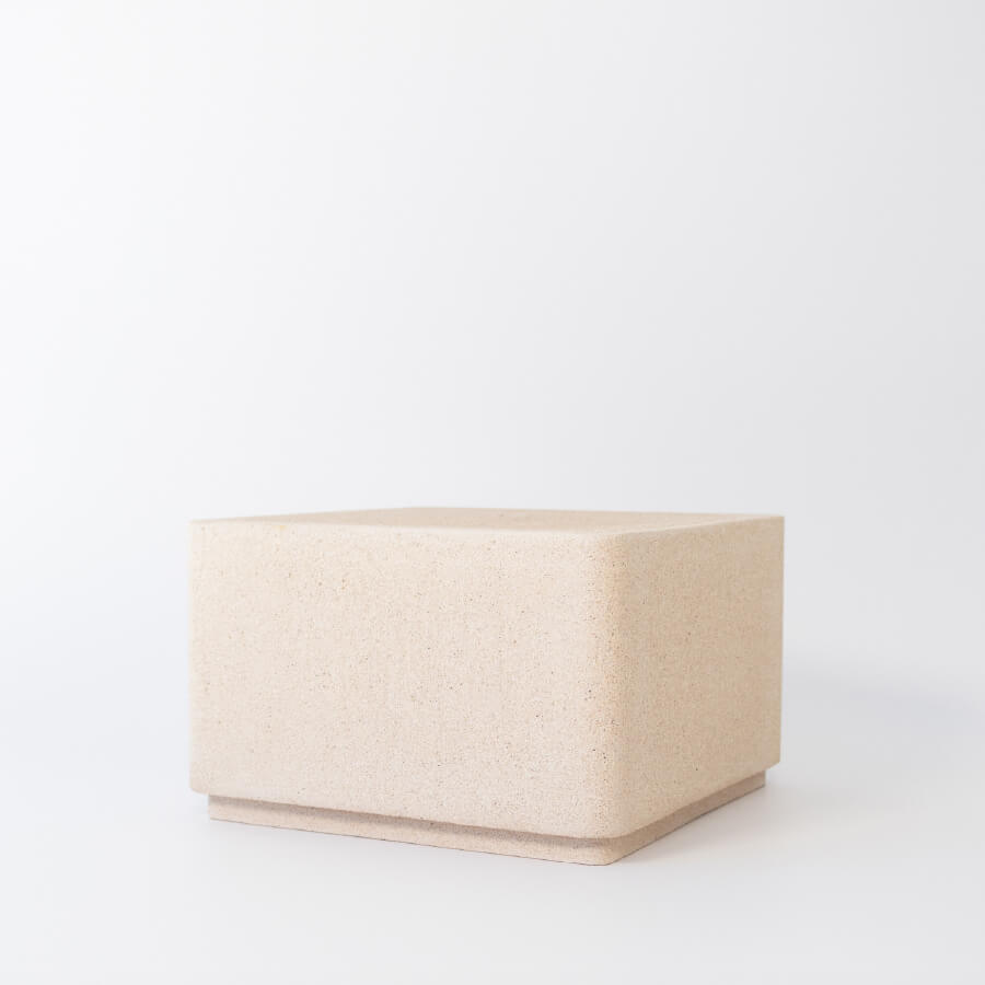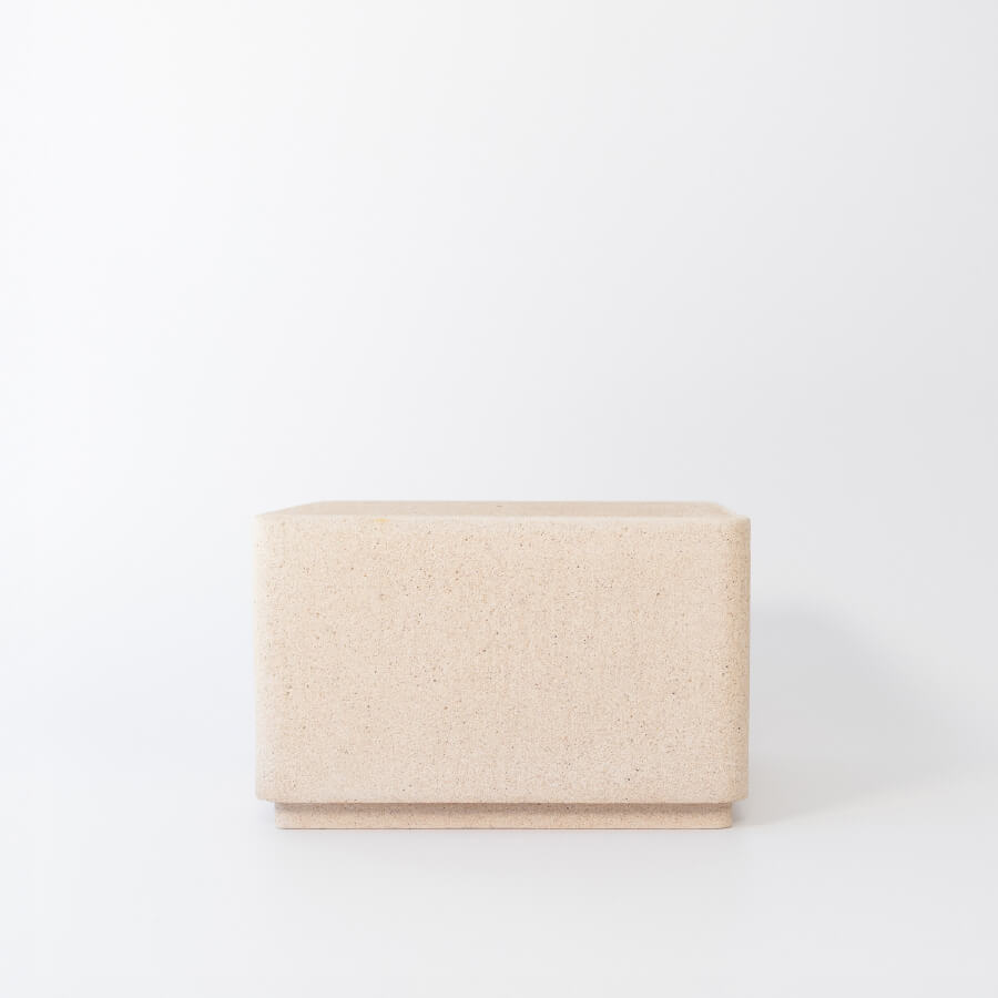 The Low Garden Urn is a minimalist garden urn featuring rounded corners and a raised base with a bath stone finish.